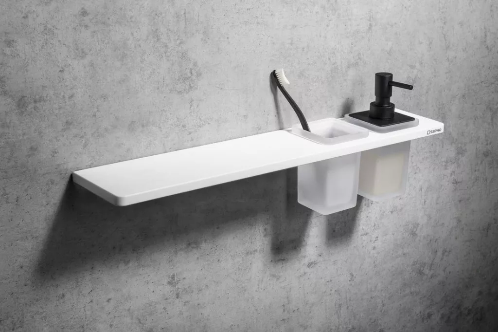 ABELINE rockstone polc, 2 furattal, 1 pohárral, 1 szappanadagolóval, 1000x12x100mm, matt fehér/fekete (AE102-0101-03)