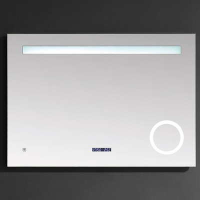 Wellis Rodos tükör LED világítással, kijelzővel, 120 × 4 × 70 cm, fényes alumínium keret, érintőgombos világítás kapcsoló (IP44), páramentesítő funkció, háromszorosan nagyító tükörbetét, óra- és hőmérséklet kijelzés, hidegfehér fény árnyalat (6000 K).