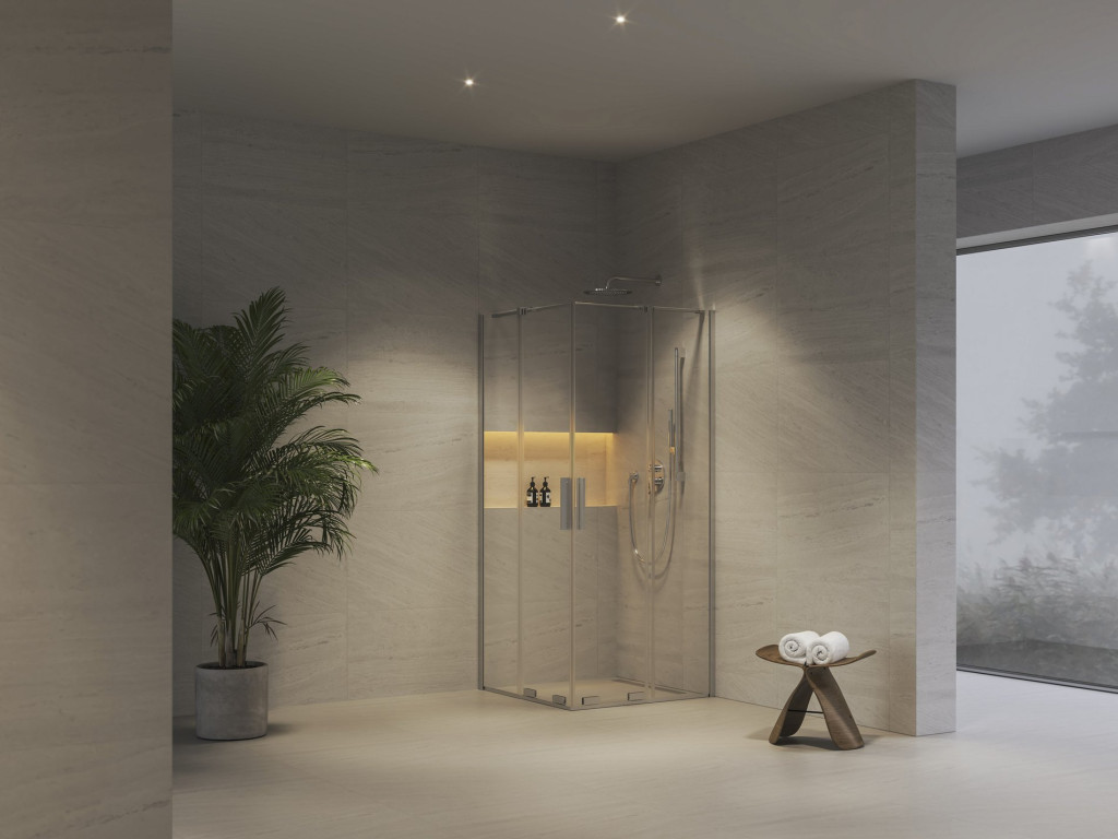 A zuhanykabin két fix és két toló elemből áll, amelyek az alsó futógörgők segítségével a sínben mozognak. A termék a fürdőszoba burkolt sarkába szerelhető, közvetlenül a padlóra beépített zuhanyfolyókával vagy padlóösszefolyóval, illetve Ravak Angela, Perseus Pro, Perseus Pro Flat és Perseus Pro Chrome zuhanytálcákra. A merevítők az ajtó csomagjának részei.