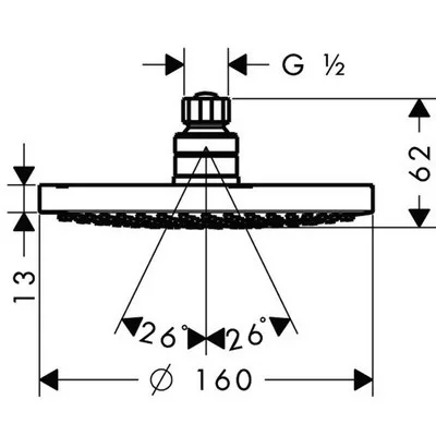 Hansgrohe Croma 1jet fejzuhany, króm. Jellemzők: zuhanyfej mérete: 160 mm. Gömbcsukló: állítható szögű fejzuhany, vízsugár fajta: Rain. Rain vízsugár átfolyási mennyisége (3 bar mellett): 17 l/perc, teljesen krómozott vízsugártárcsa, vízsugártárcsa anyaga: műanyag QuickClean, szerelés: mennyezet vagy fal, csatlakozómenet G ½.